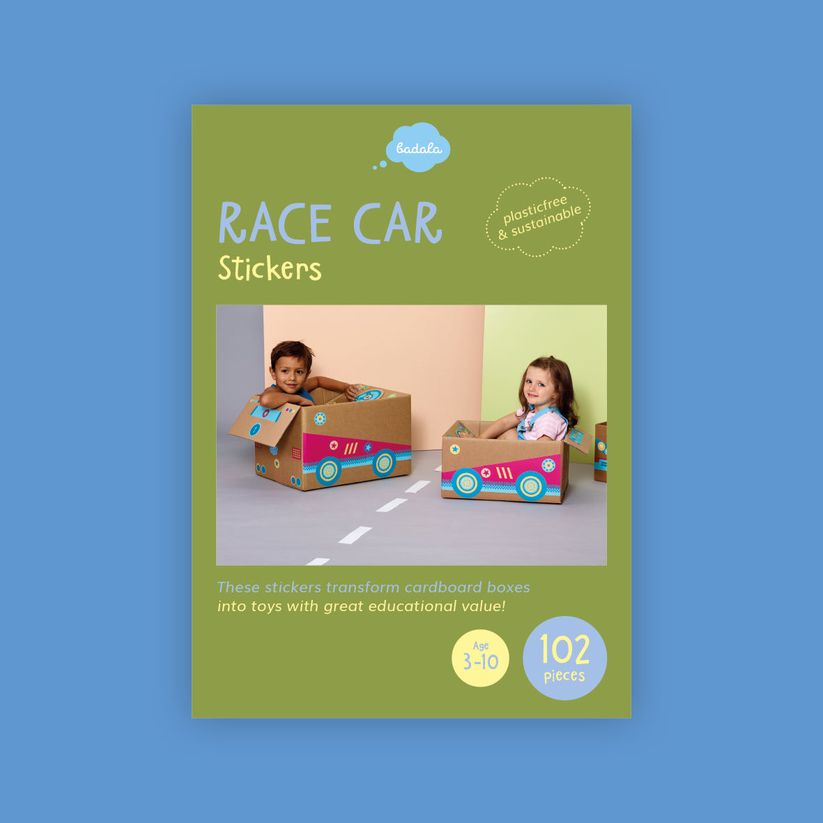 ReBoxy "Dirkalnik" je ustvarjalna igrača, ki otroke spodbuja k igri brez zaslona. S kompletom barvitih nalepk spremenijo škatlo v pravi dirkalni avto – z žarometi, volanom in izpušno cevjo!